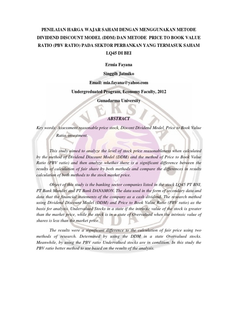 Penilaian Harga Wajar Saham DDM Dan PBV Ratio